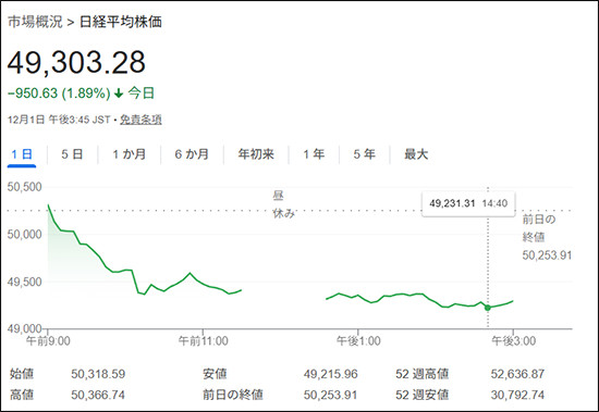 12月1日,日经225指数高开低走,盘中一度跌超千点,跌幅超2%。最终收盘时,日经225指数收跌1.89%,报49303.28点;
